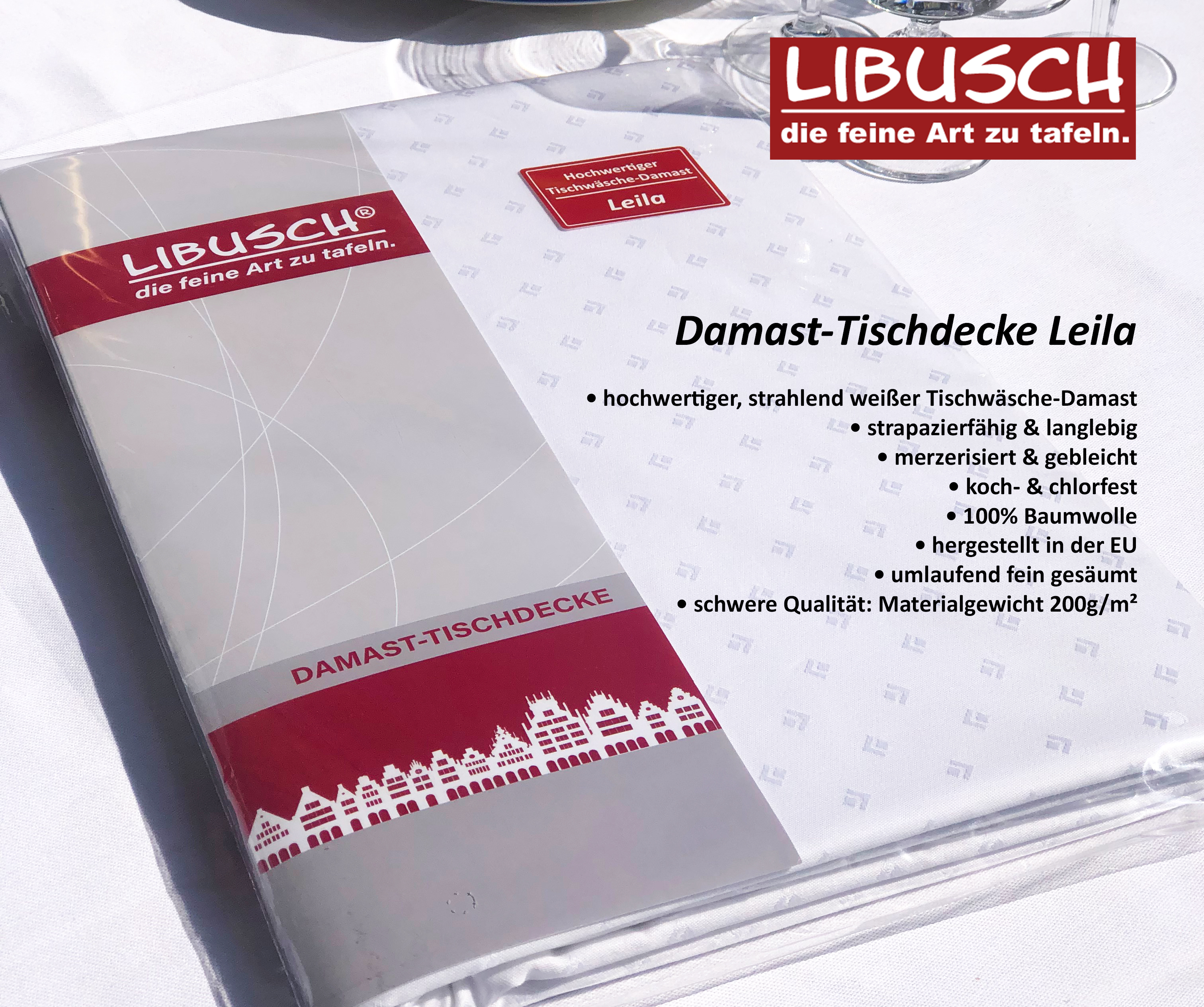 | Weitere verfügbare Damast-Tischdecken Leila rund: | Damast-Tischdecke Leila rund Ø 140 cm, Damast-Tischdecke Leila rund Ø 160 cm, Damast-Tischdecke Leila rund Ø 180 cm, Damast-Tischdecke Leila rund Ø 200cm |