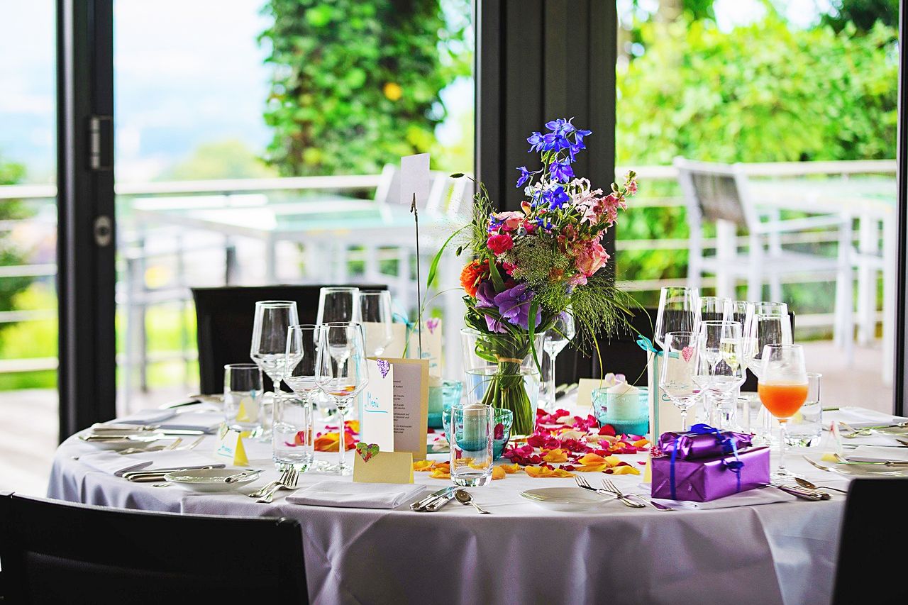 Sehr gut passt zu dieser runden Tischdecke eine farbenfrohe Dekoration oder ein bunter Blumenstrauss mitten auf dem Tisch.