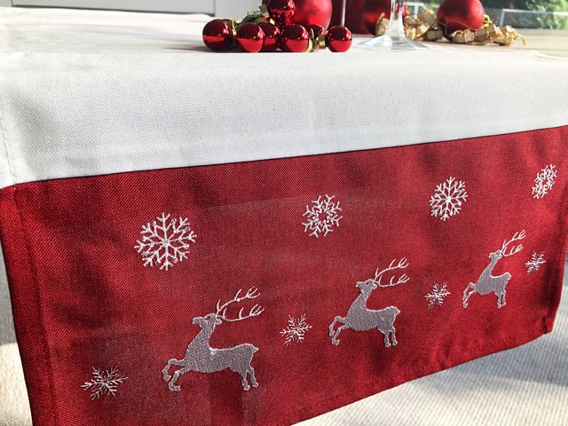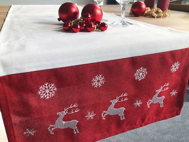 Ein schicker Tischläufer in weiß mit rot abgesetzten Kopfseiten, die mit dekorativen Elchen verziert sind. Der Weihnachts-Tischläufer ist 40x140cm groß. Der abgesetzte rote Rand (Randbreite 20cm) setzt sich schön von der strahlend weißen Mittelpartie ab. Besonders ansprechend wirkt der Tischläufer auf einem massiven Holztisch. Er ist in allen Wintermonaten ein echter Blickfang.